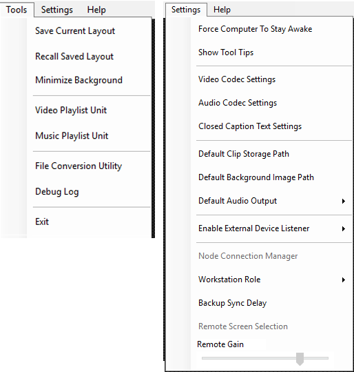 Select this to save the current layout of all control windows. This also records which playlist file belongs to each open playlist, along with the screen destination and position/size of each window. (Playlist and Confidence Monitor.)